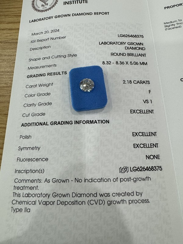 2.18CT F VS1 3EX CVD Phòng thí nghiệm trưởng thành kim cương cắt tròn Giấy chứng nhận IGI