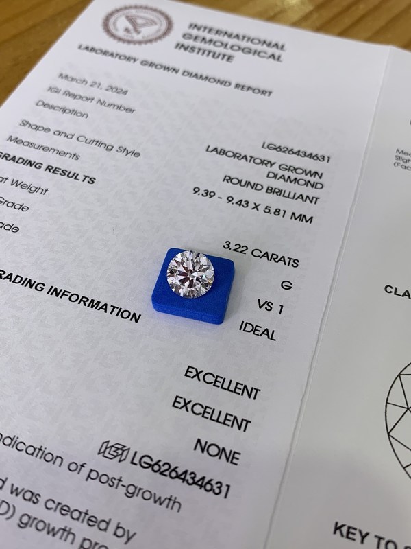 3.23CT G VS1 3EX CVD Phòng thí nghiệm trưởng thành kim cương cắt tròn Giấy chứng nhận IGI