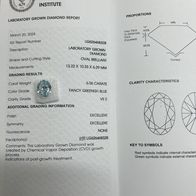 6.06ct Lab Growm Diamond Oval Cut CVD Fancy Greensh Blue VS2 2EX N IGI