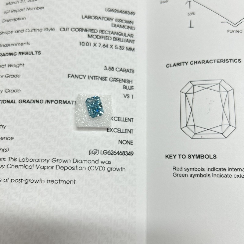 3.58ct Phòng thí nghiệm phát triển kim cương cắt sáng CVD Fancy Intense Xanh xanh VS1 2EX N IGI